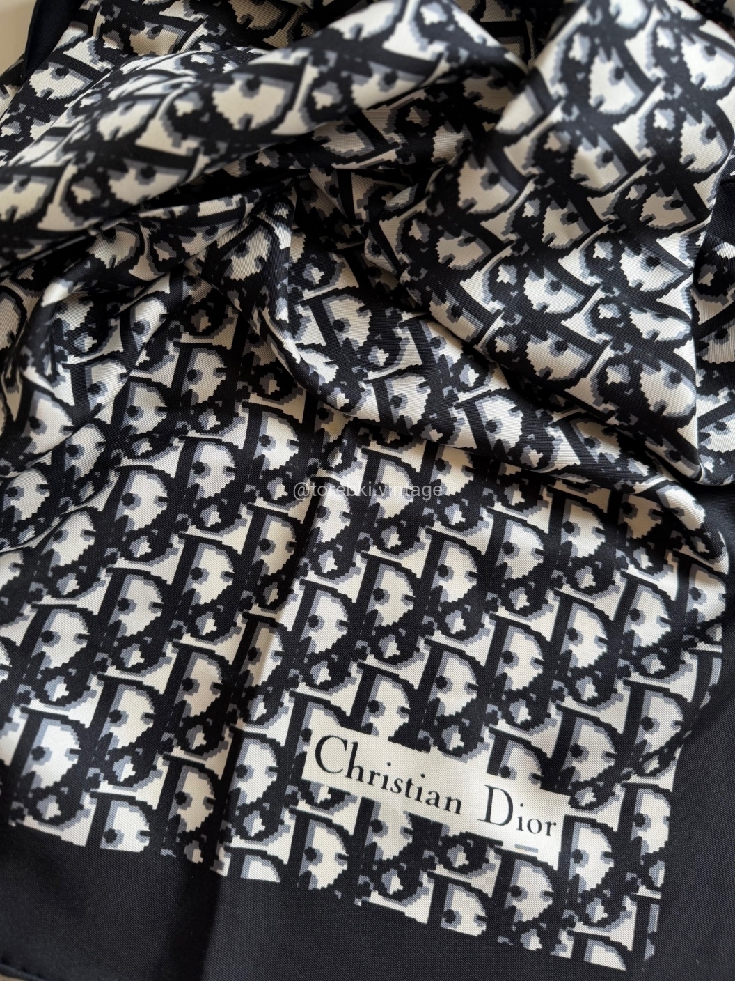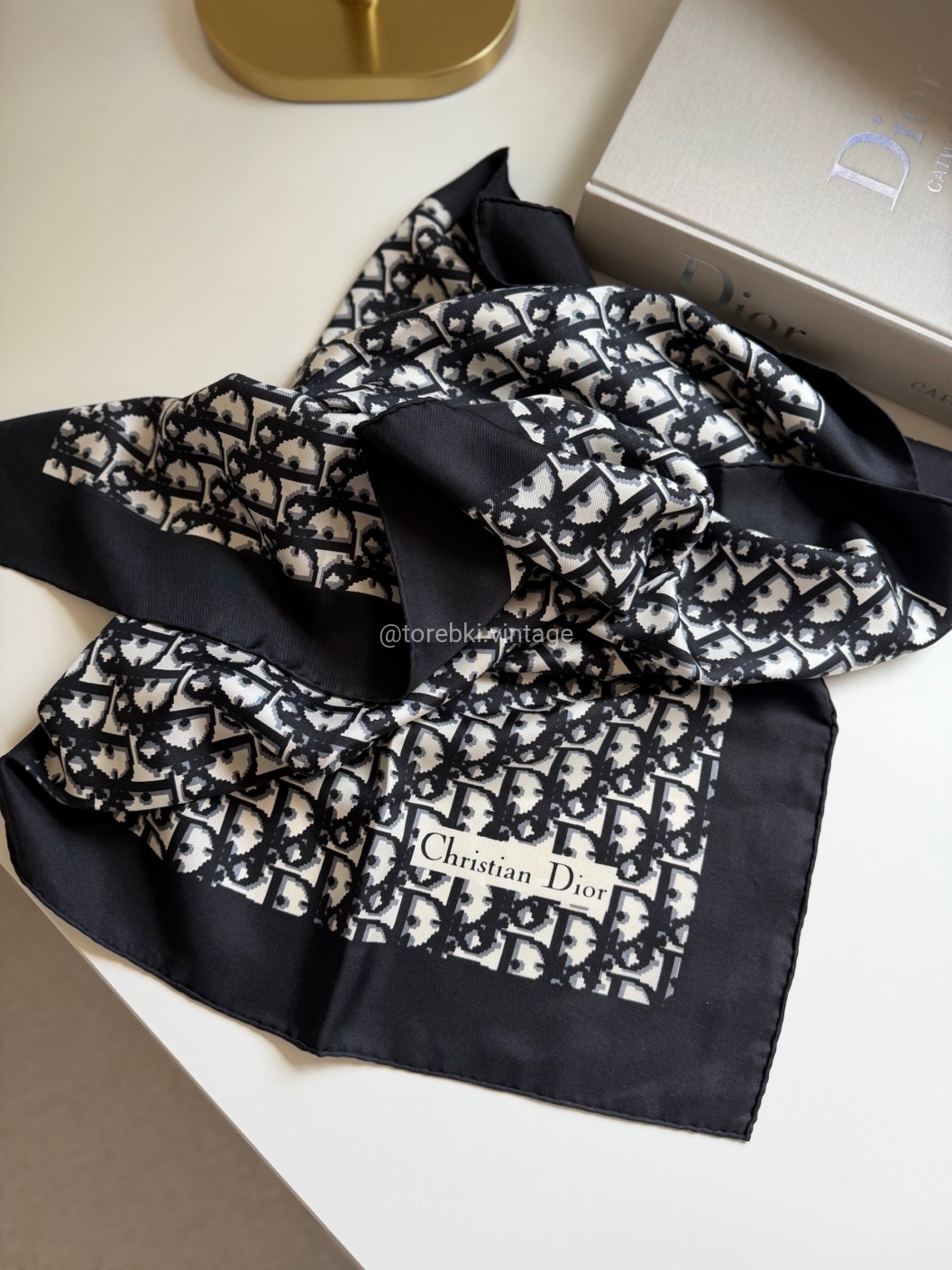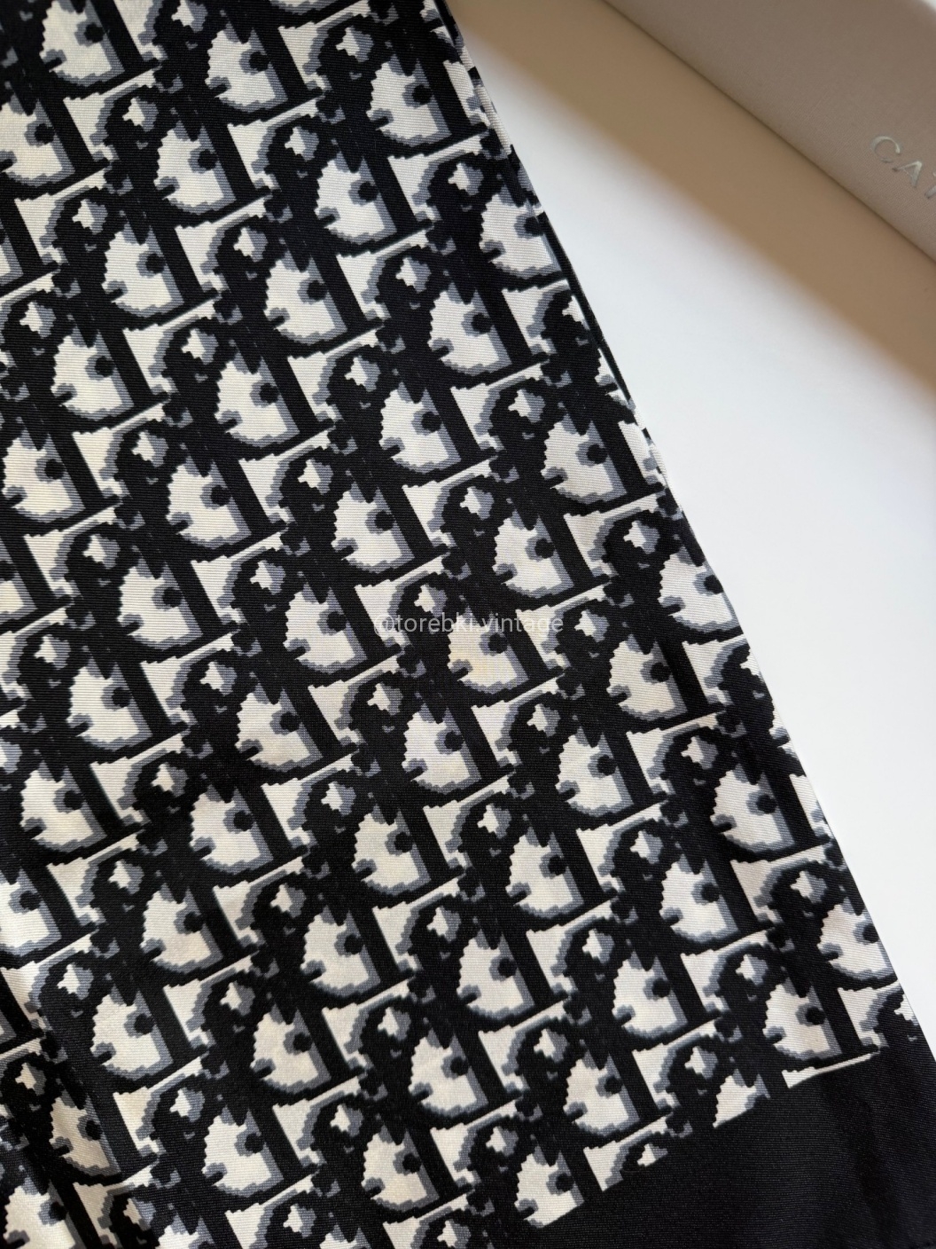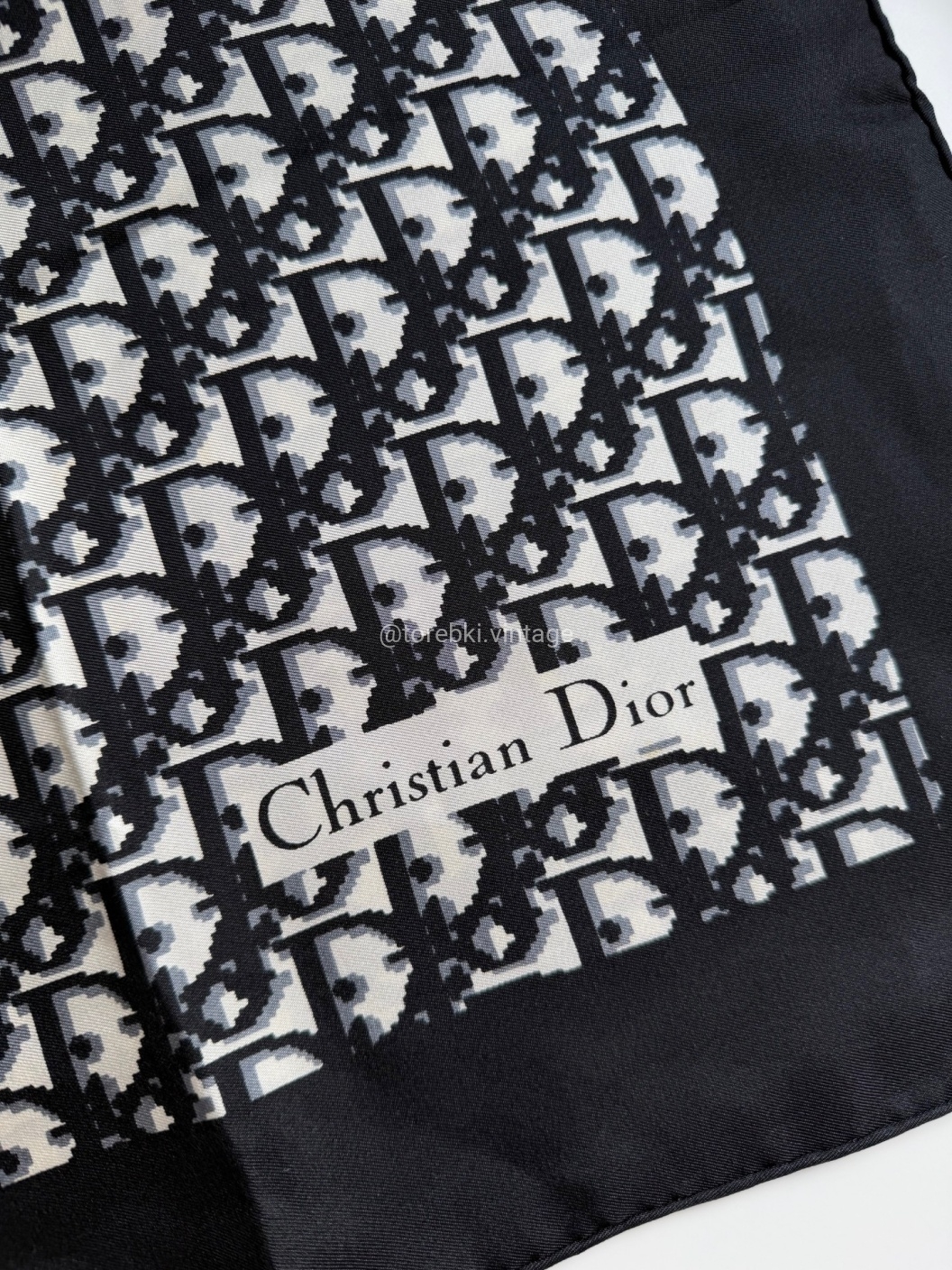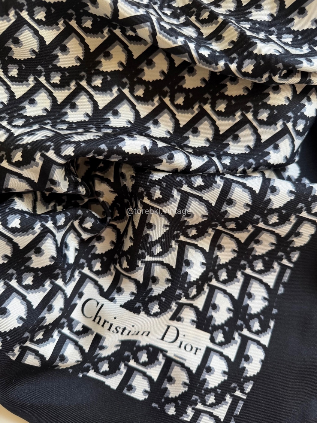 Jedwabna jednostronna apaszka vintage Christiana Diora w eleganckiej i ponadczasowej intensywnej, wyrazistej, czarno-biało-szarej kolorystyce. Wykonana została w 100% z jedwabiu. Dość duży format, który daje wiele możliwości stylizacji. Metki z logo i ze składem prawdopodobnie zostały odcięte i zaginęły. Widoczne 2 mini plamki (bardzo znikome), brak zaciągnięć. Generalnie jak na egzemplarz vintage jest to mimo wszystko rewelacyjnie zachowana apaszka.