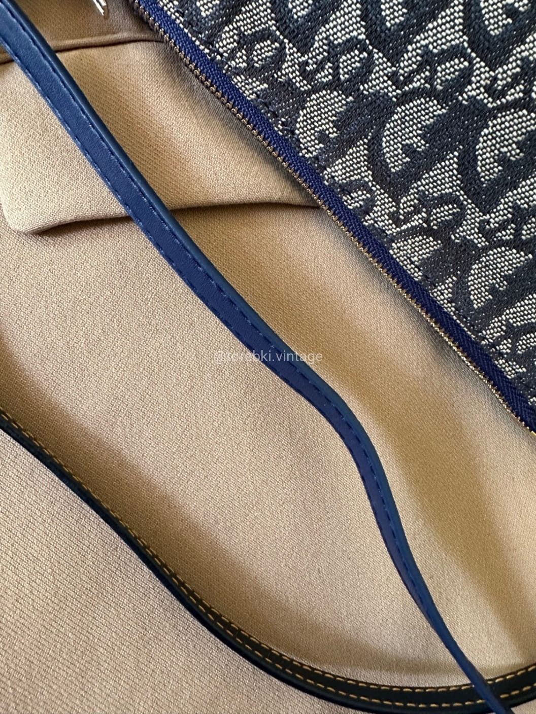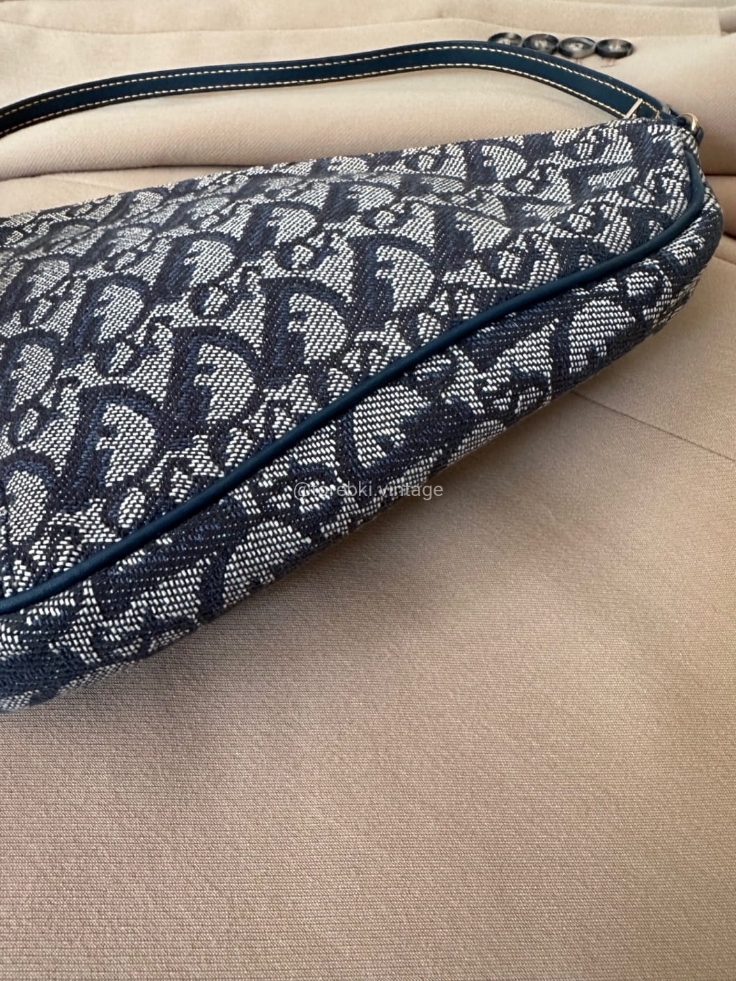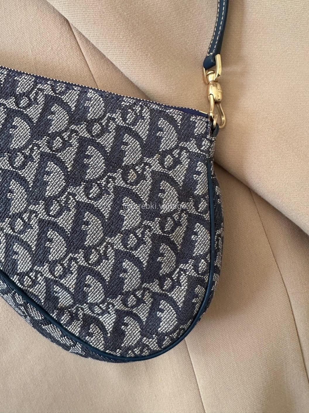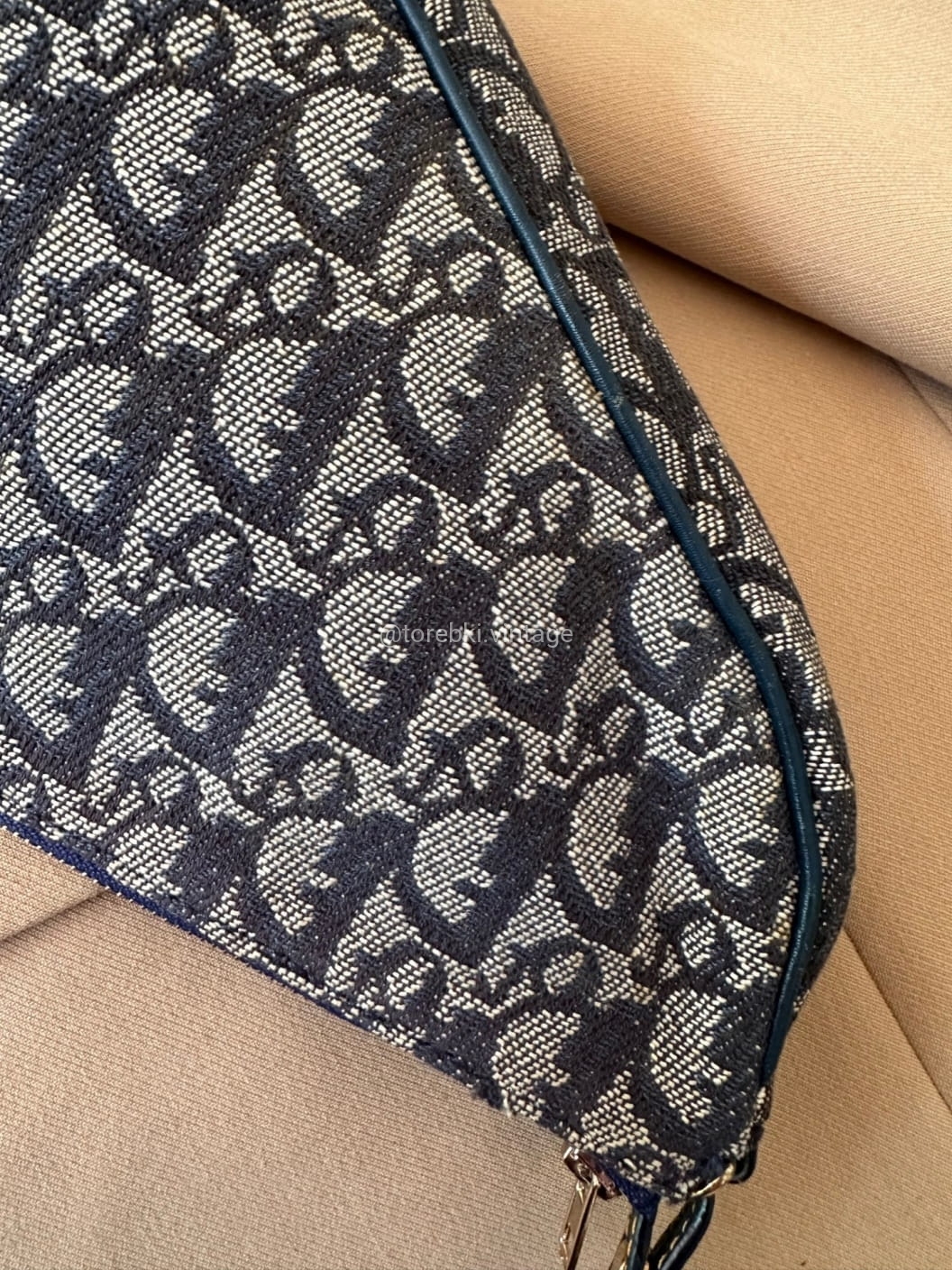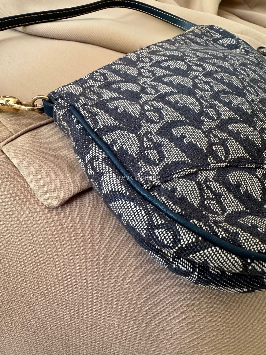 Piękna torebka Dior o niezwykle charakterystycznym kształcie siodła w ciemnogranatowo-niebieskiej kolorystyce. Wykonana została z niezwykle wytrzymałego materiału i skóry naturalnej. Zachowana została w bardzo dobrym stanie. Piękne logowania na materiale. W kilki miejscach widoczne mini plamki/przebarwienia ale nawet na zdjęciach ciężko je wychwycić, są tak niewielkie.