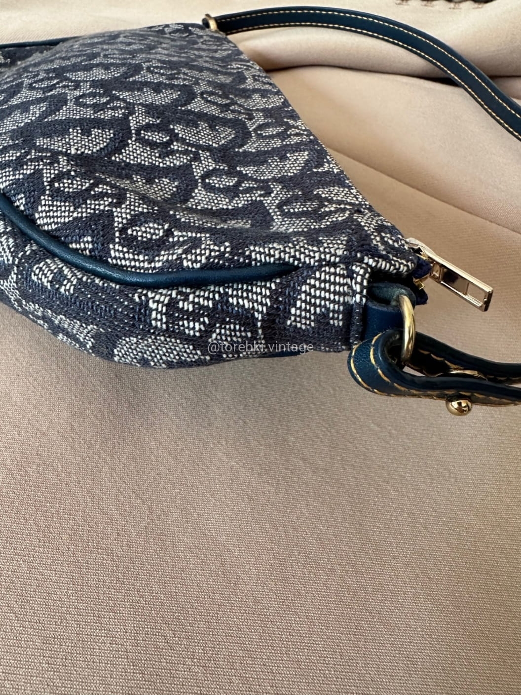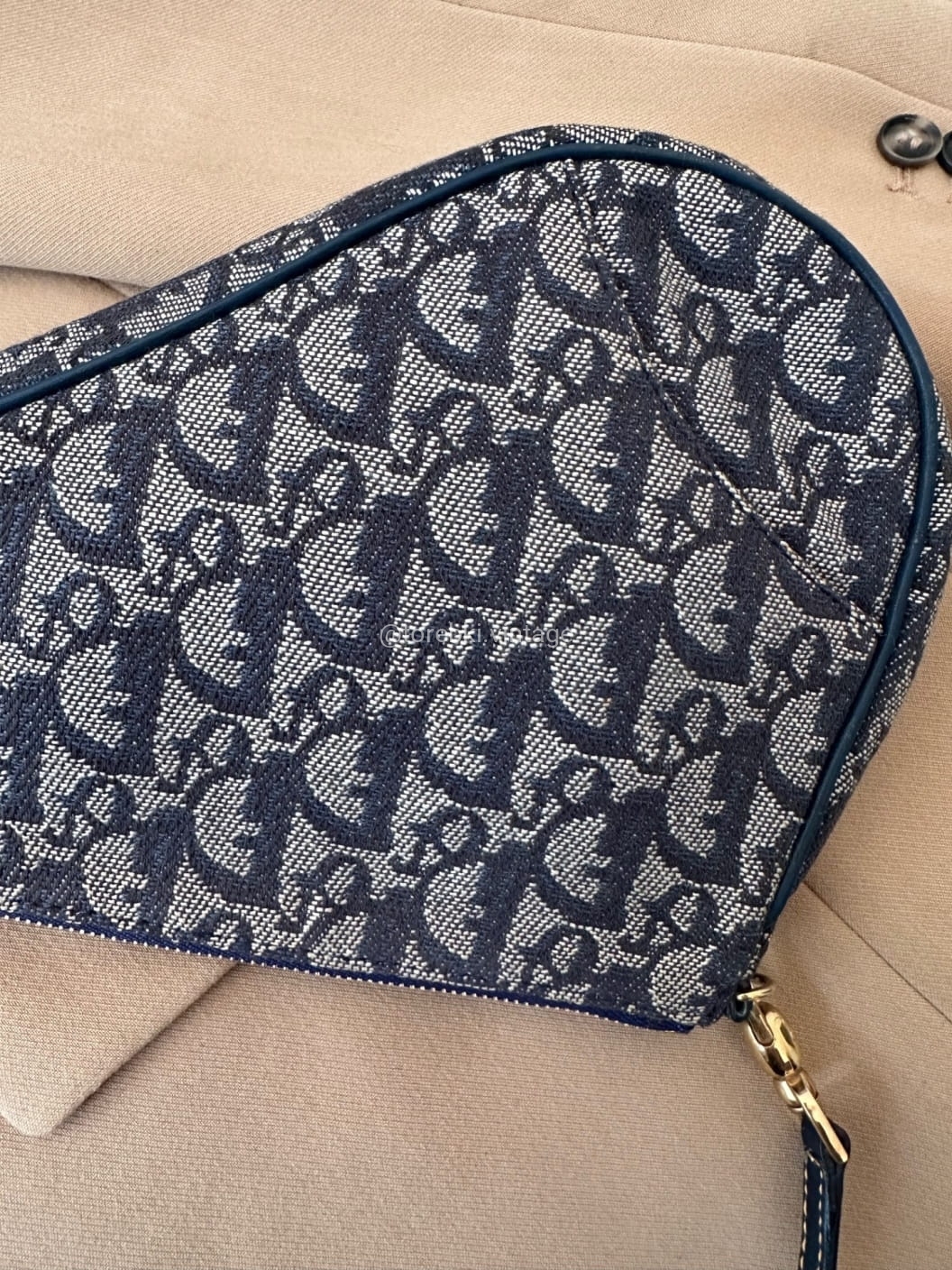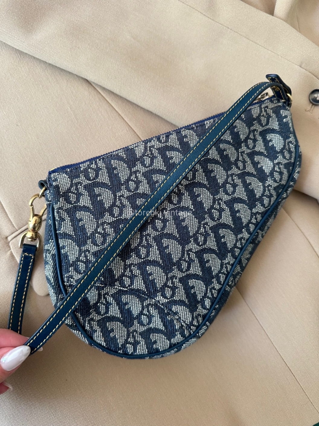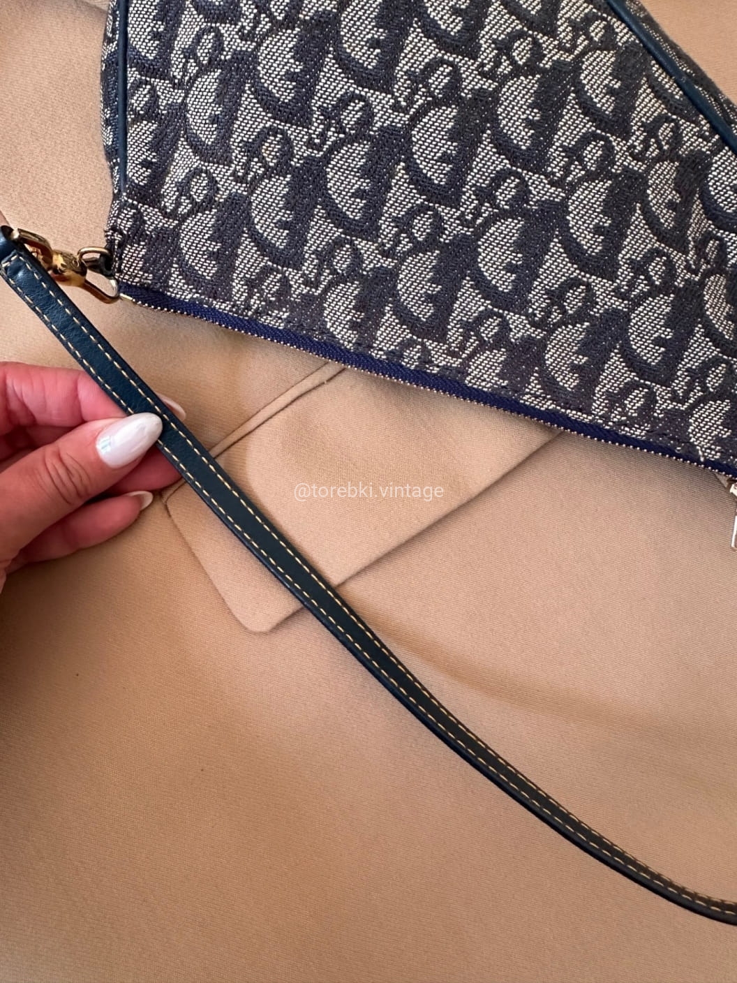 Piękna torebka Dior o niezwykle charakterystycznym kształcie siodła w ciemnogranatowo-niebieskiej kolorystyce. Wykonana została z niezwykle wytrzymałego materiału i skóry naturalnej. Zachowana została w bardzo dobrym stanie. Piękne logowania na materiale. W kilki miejscach widoczne mini plamki/przebarwienia ale nawet na zdjęciach ciężko je wychwycić, są tak niewielkie.