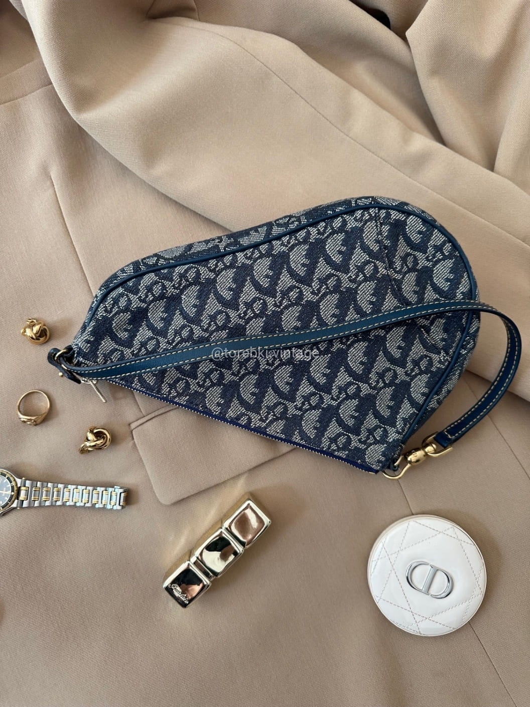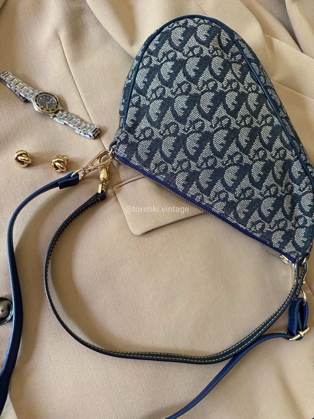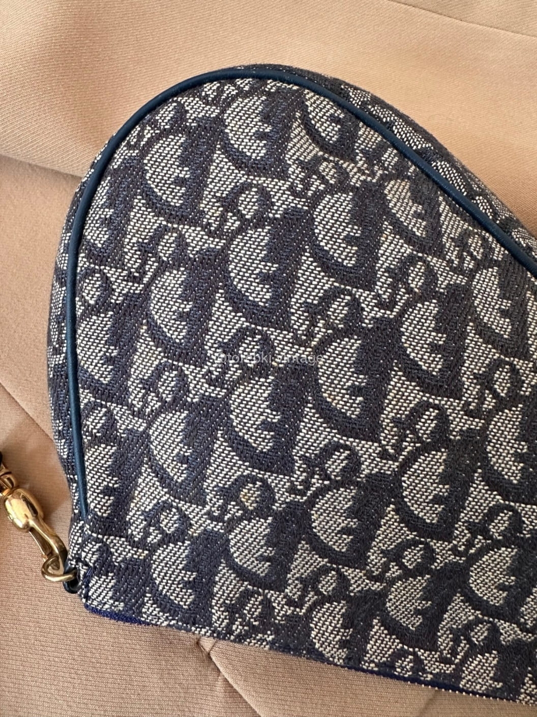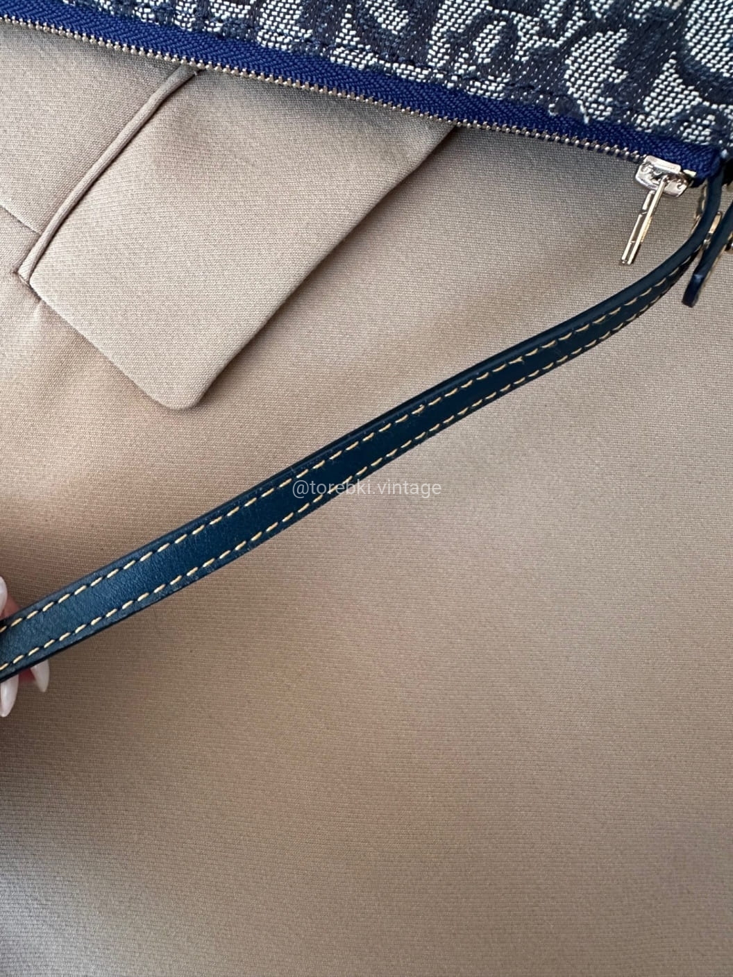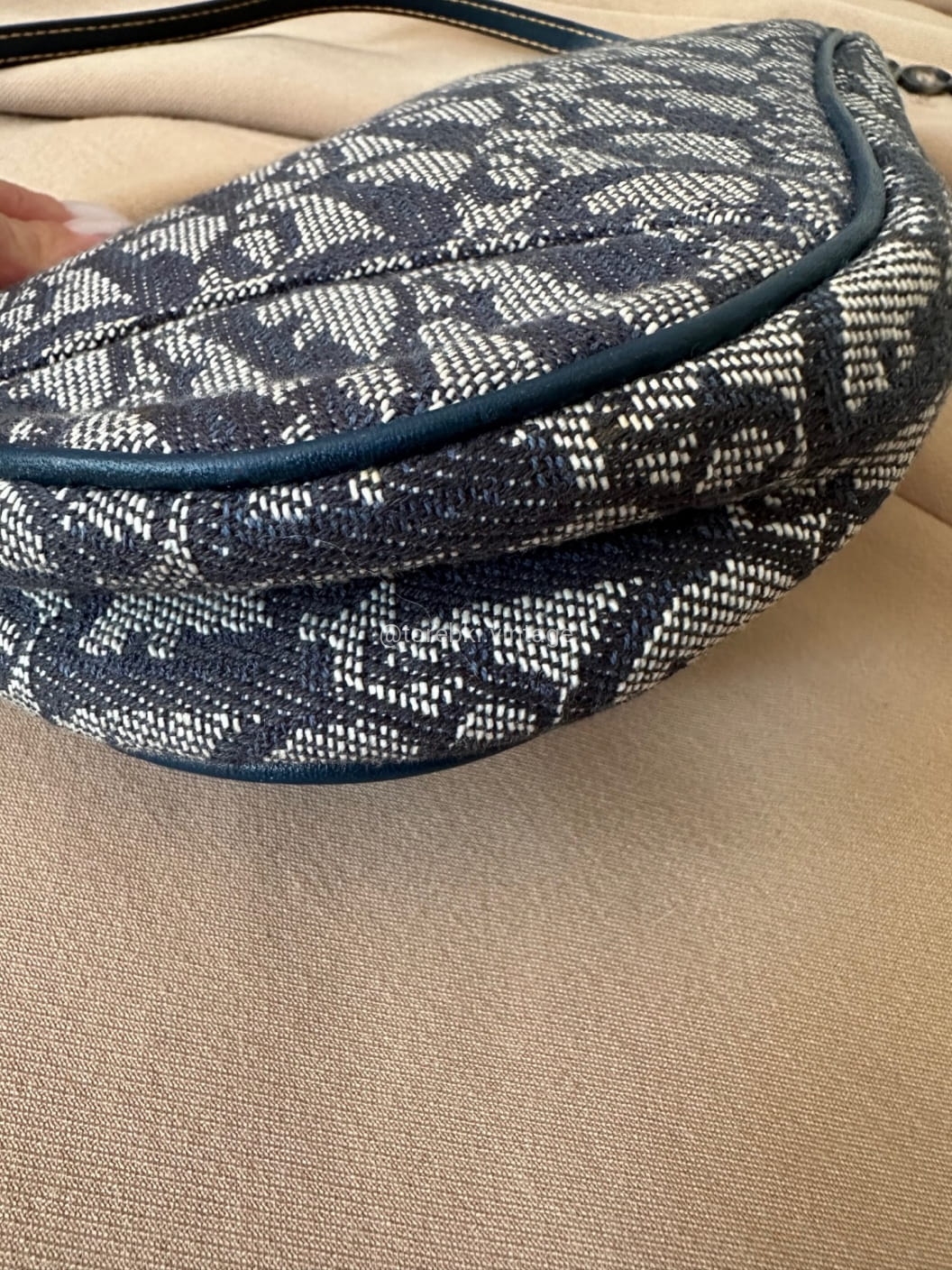 Piękna torebka Dior o niezwykle charakterystycznym kształcie siodła w ciemnogranatowo-niebieskiej kolorystyce. Wykonana została z niezwykle wytrzymałego materiału i skóry naturalnej. Zachowana została w bardzo dobrym stanie. Piękne logowania na materiale. W kilki miejscach widoczne mini plamki/przebarwienia ale nawet na zdjęciach ciężko je wychwycić, są tak niewielkie.