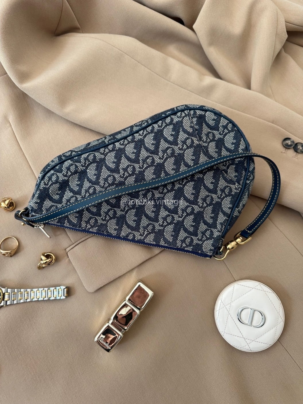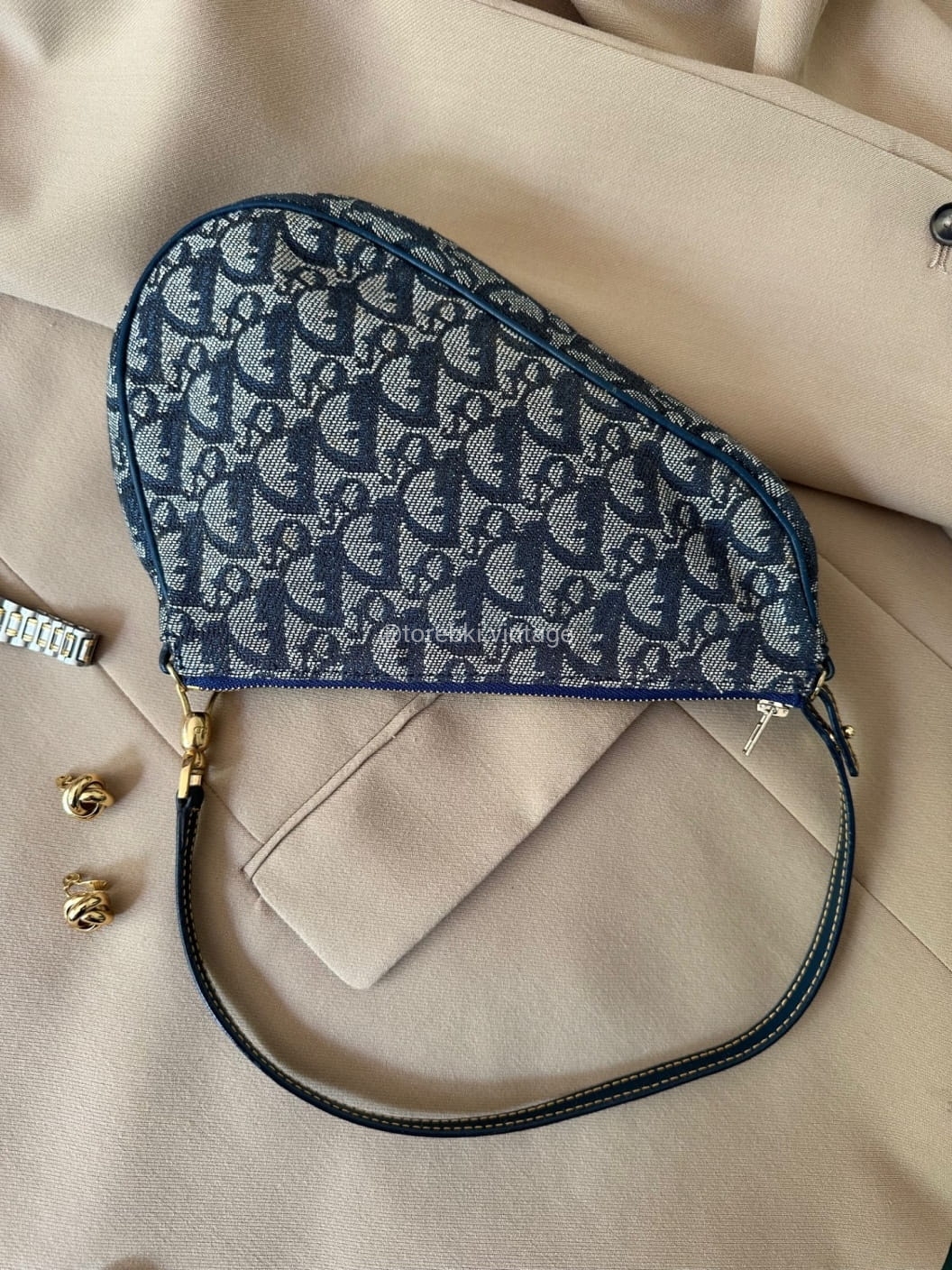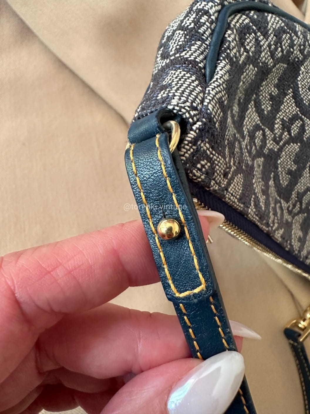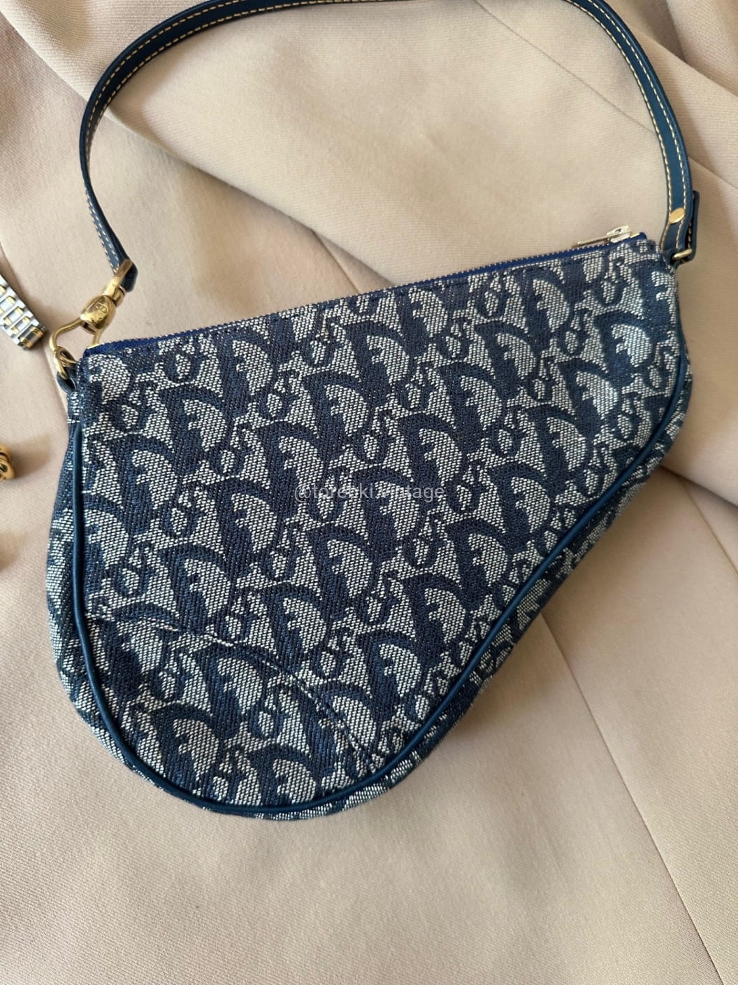 Piękna torebka Dior o niezwykle charakterystycznym kształcie siodła w ciemnogranatowo-niebieskiej kolorystyce. Wykonana została z niezwykle wytrzymałego materiału i skóry naturalnej. Zachowana została w bardzo dobrym stanie. Piękne logowania na materiale. W kilki miejscach widoczne mini plamki/przebarwienia ale nawet na zdjęciach ciężko je wychwycić, są tak niewielkie.
