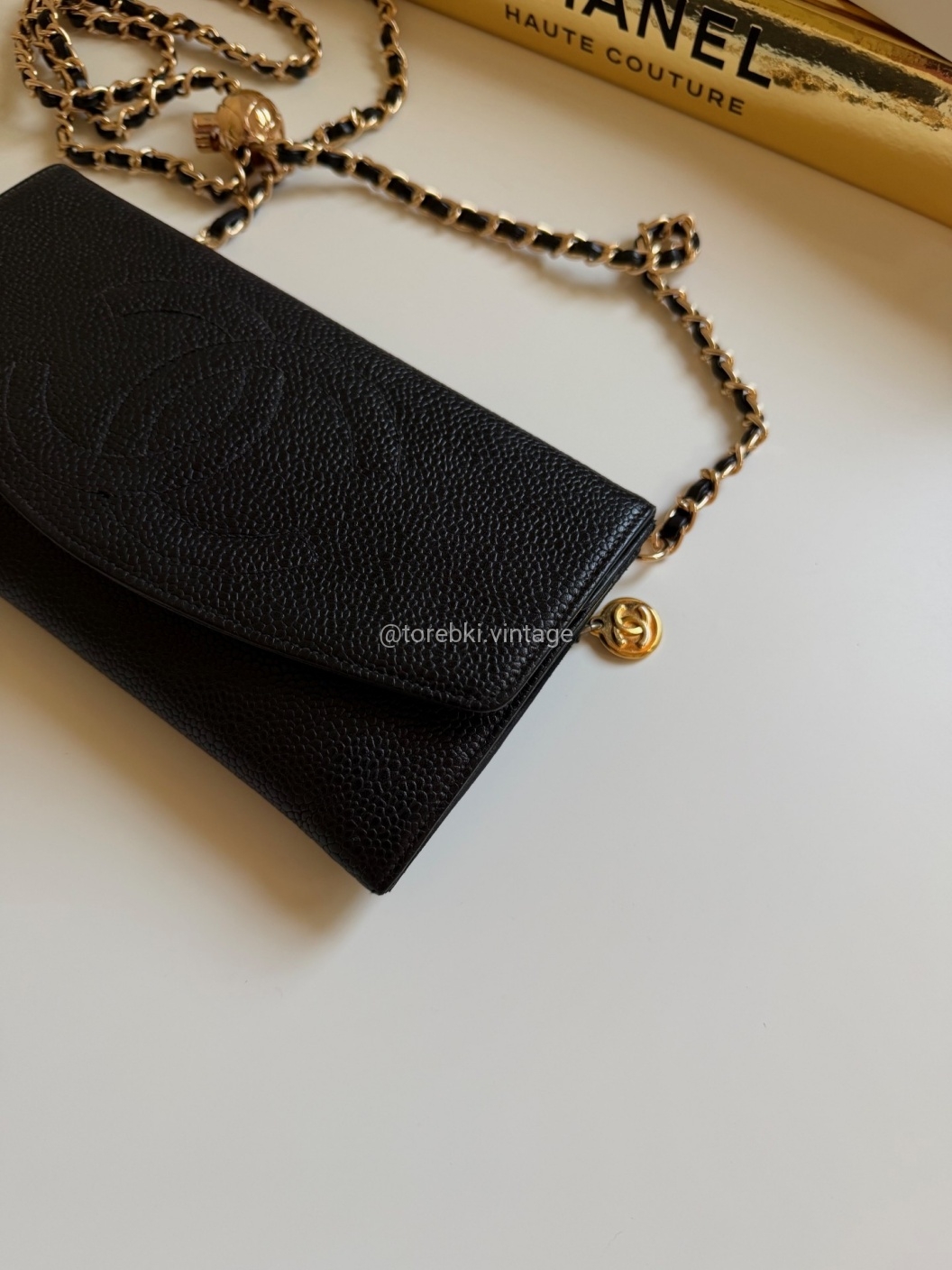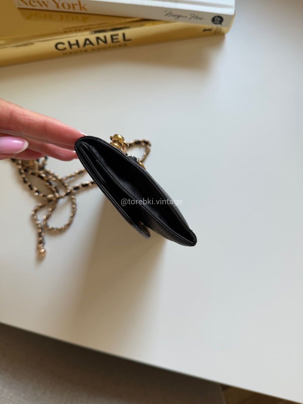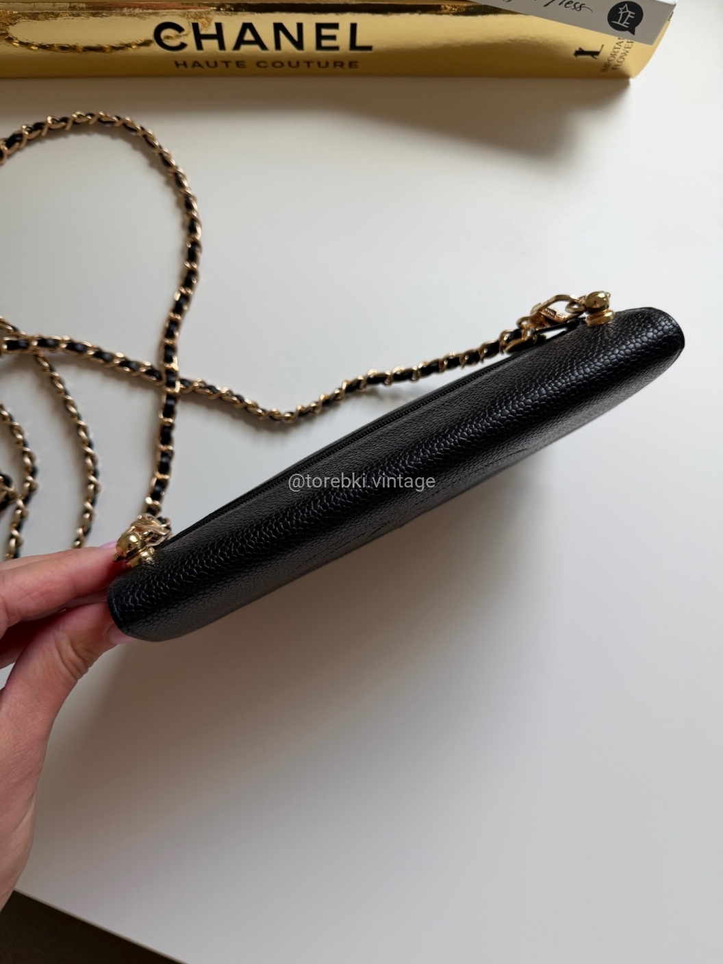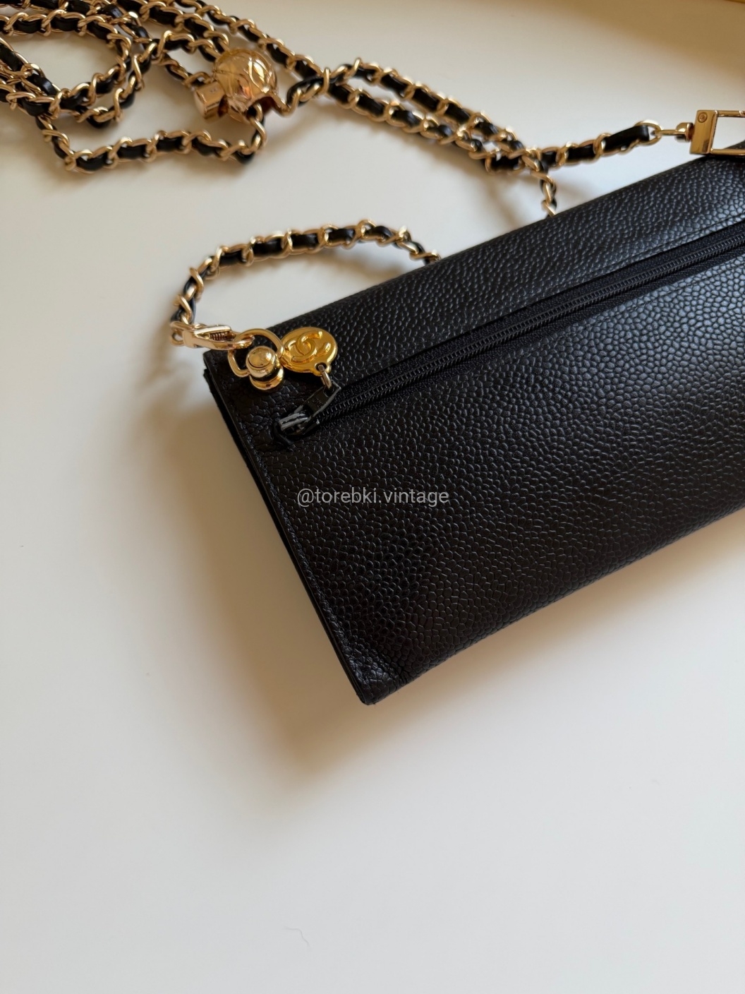 Łańcuszek można regulować kulką. Maksymalna długość łańcuszka to 130 cm (długość mierzona wraz z karabińczykami). Torebkę można nosić komfortowo jako crossbody. Ważna informacja - łańcuszek jest tylko i wyłącznie stylizowany na Chanel, nie jest to produkt marki. Jest dodany do portfela tak by można było korzystać z niego w formie torebki.