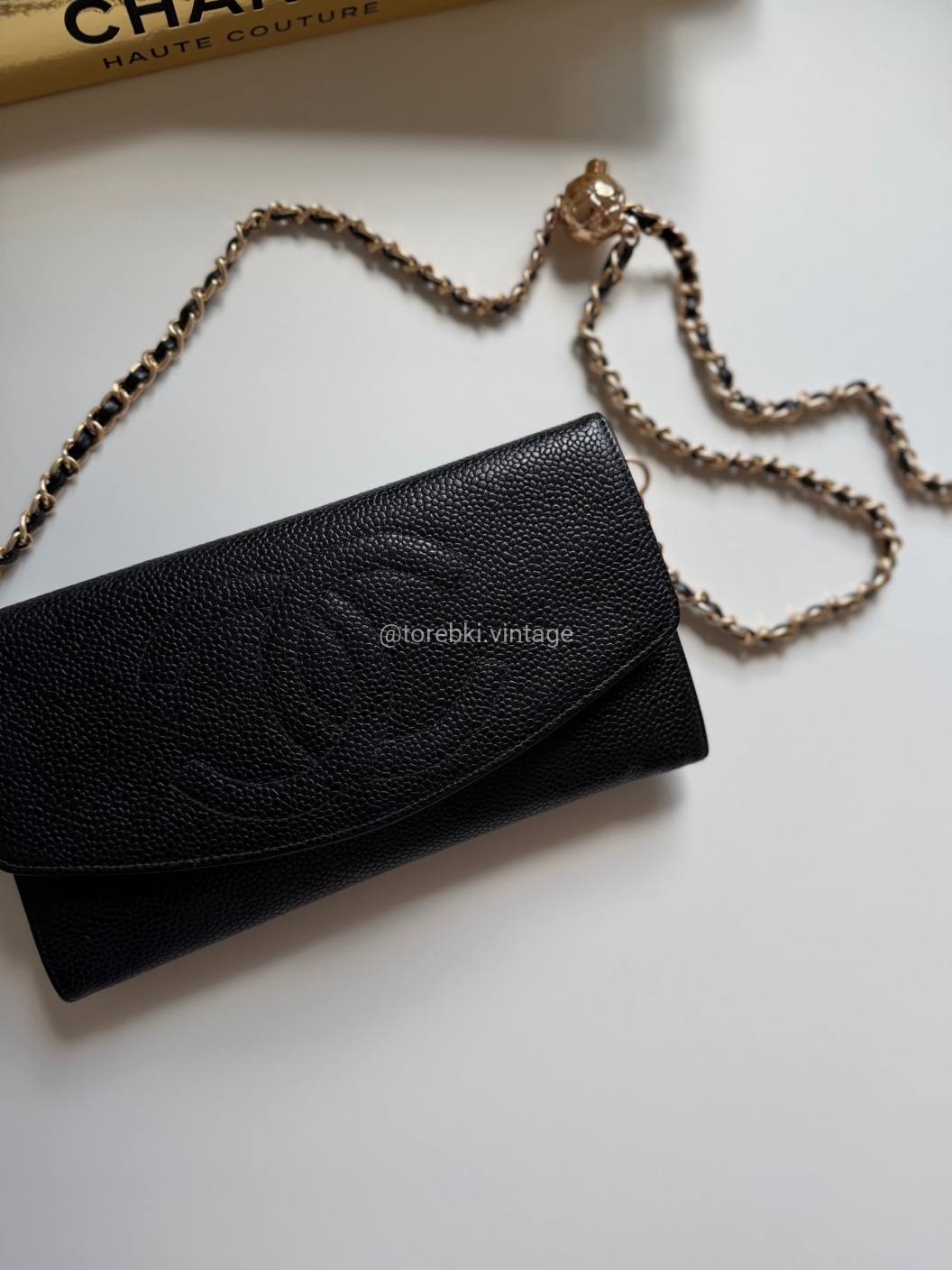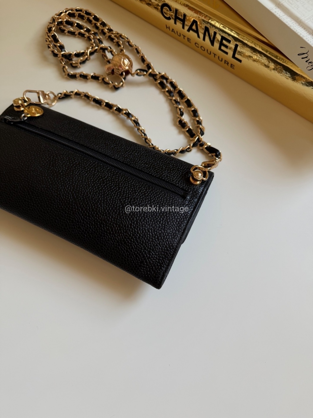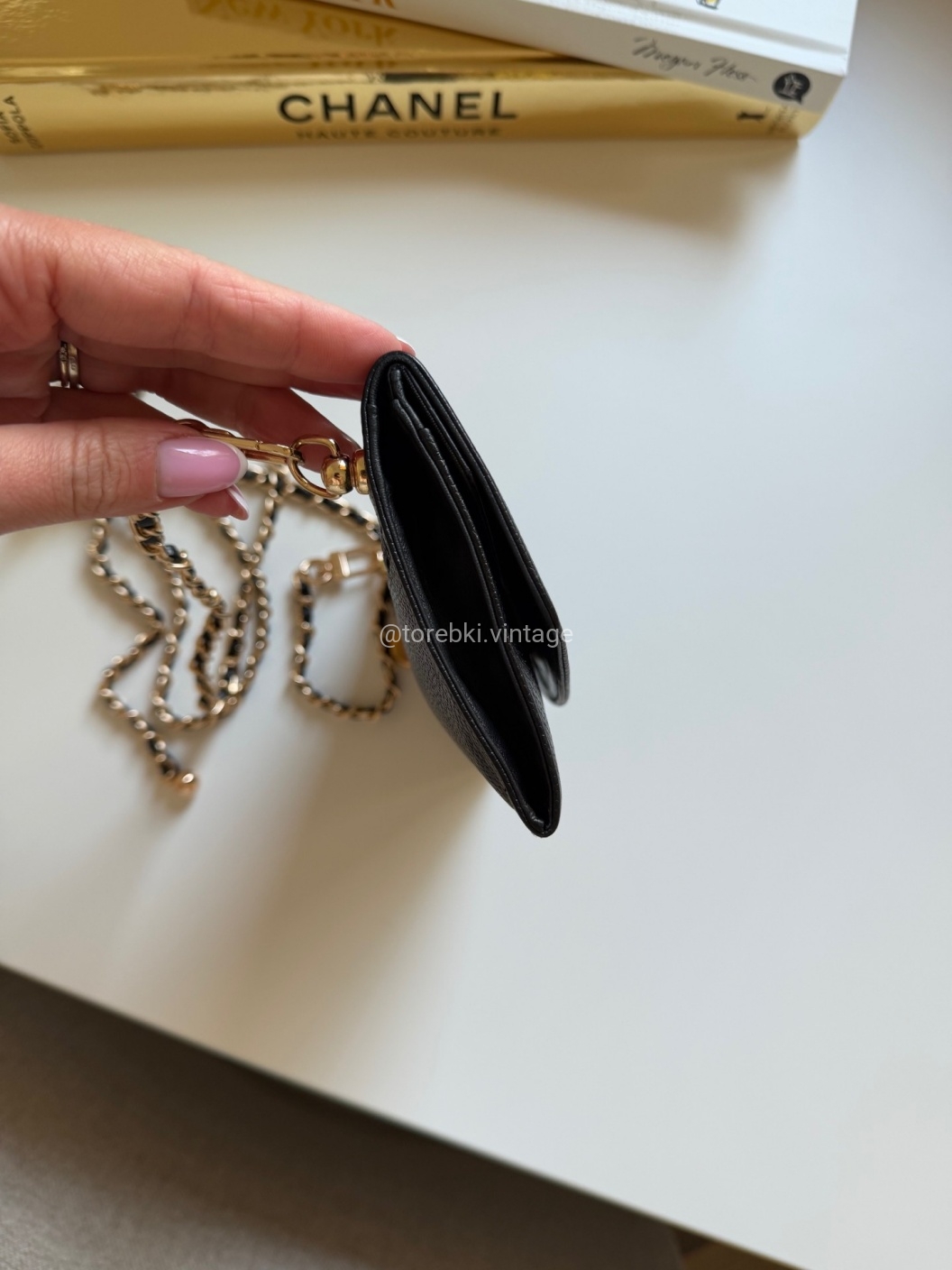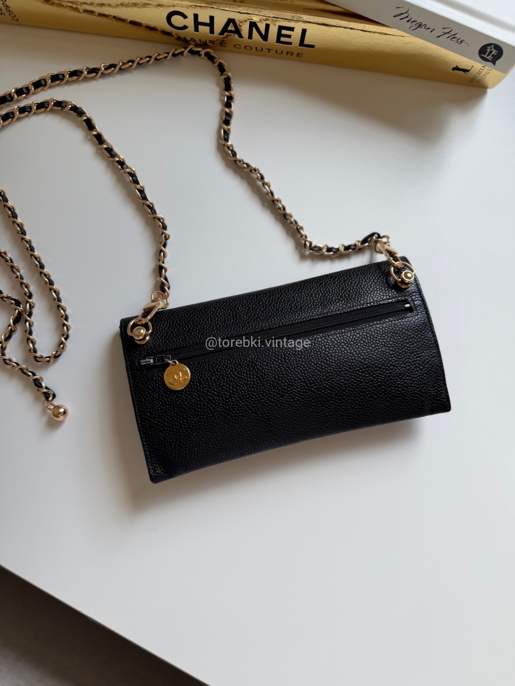 Łańcuszek można regulować kulką. Maksymalna długość łańcuszka to 130 cm (długość mierzona wraz z karabińczykami). Torebkę można nosić komfortowo jako crossbody. Ważna informacja - łańcuszek jest tylko i wyłącznie stylizowany na Chanel, nie jest to produkt marki. Jest dodany do portfela tak by można było korzystać z niego w formie torebki.