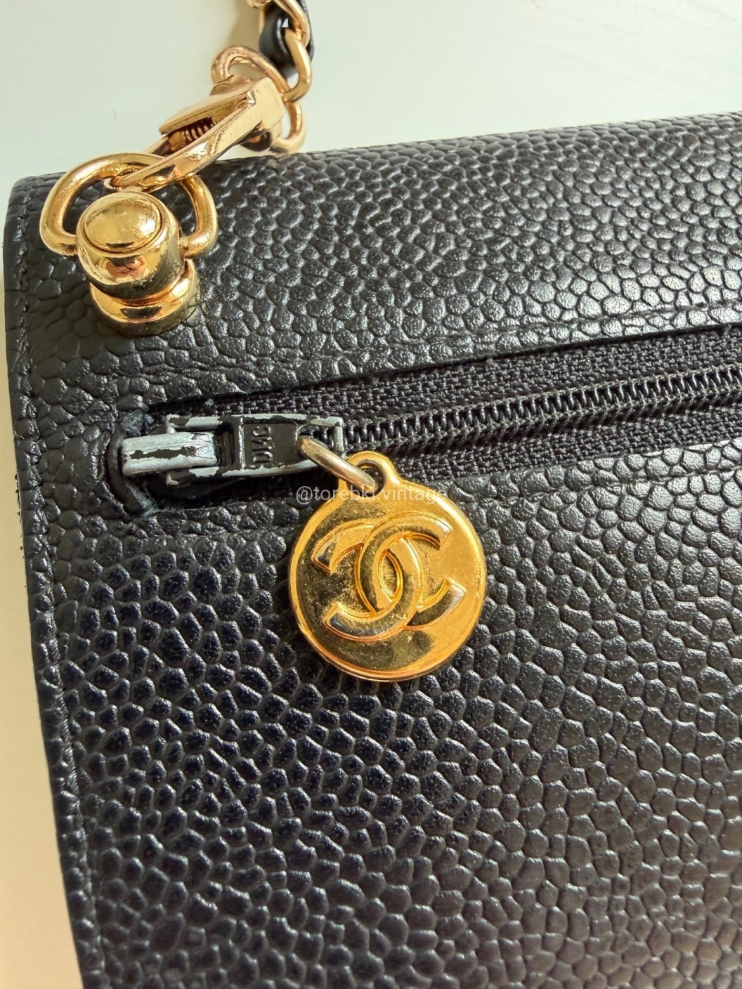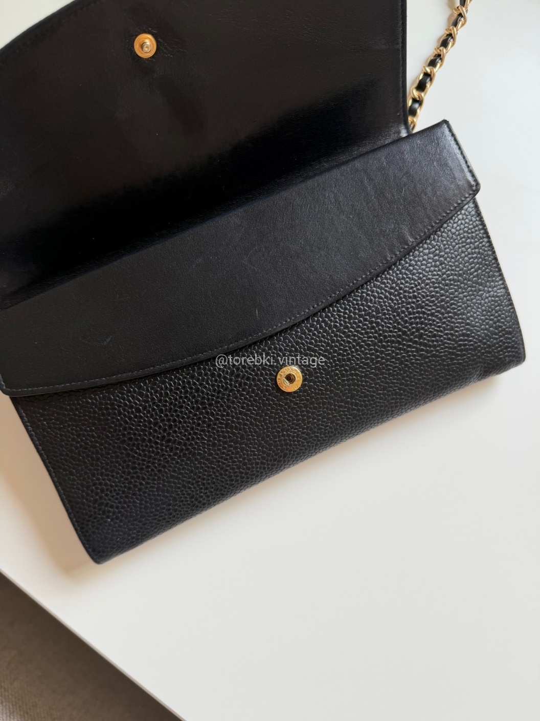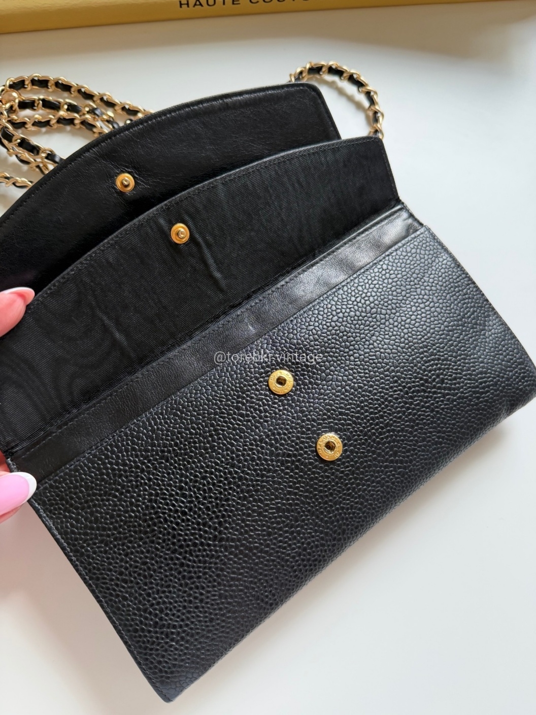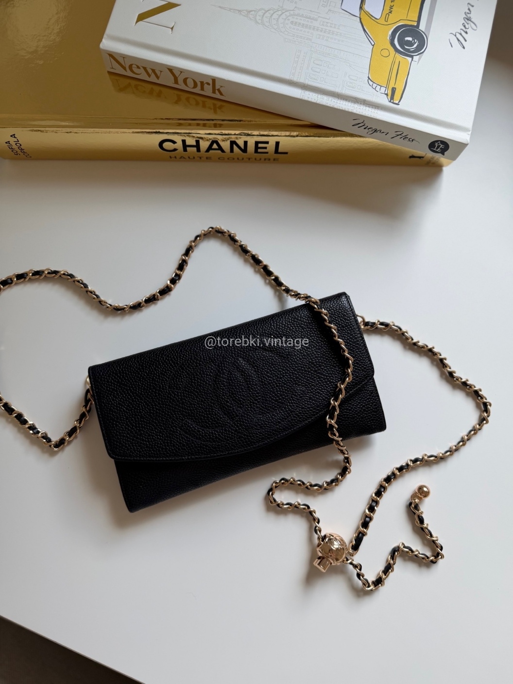 Łańcuszek można regulować kulką. Maksymalna długość łańcuszka to 130 cm (długość mierzona wraz z karabińczykami). Torebkę można nosić komfortowo jako crossbody. Ważna informacja - łańcuszek jest tylko i wyłącznie stylizowany na Chanel, nie jest to produkt marki. Jest dodany do portfela tak by można było korzystać z niego w formie torebki.