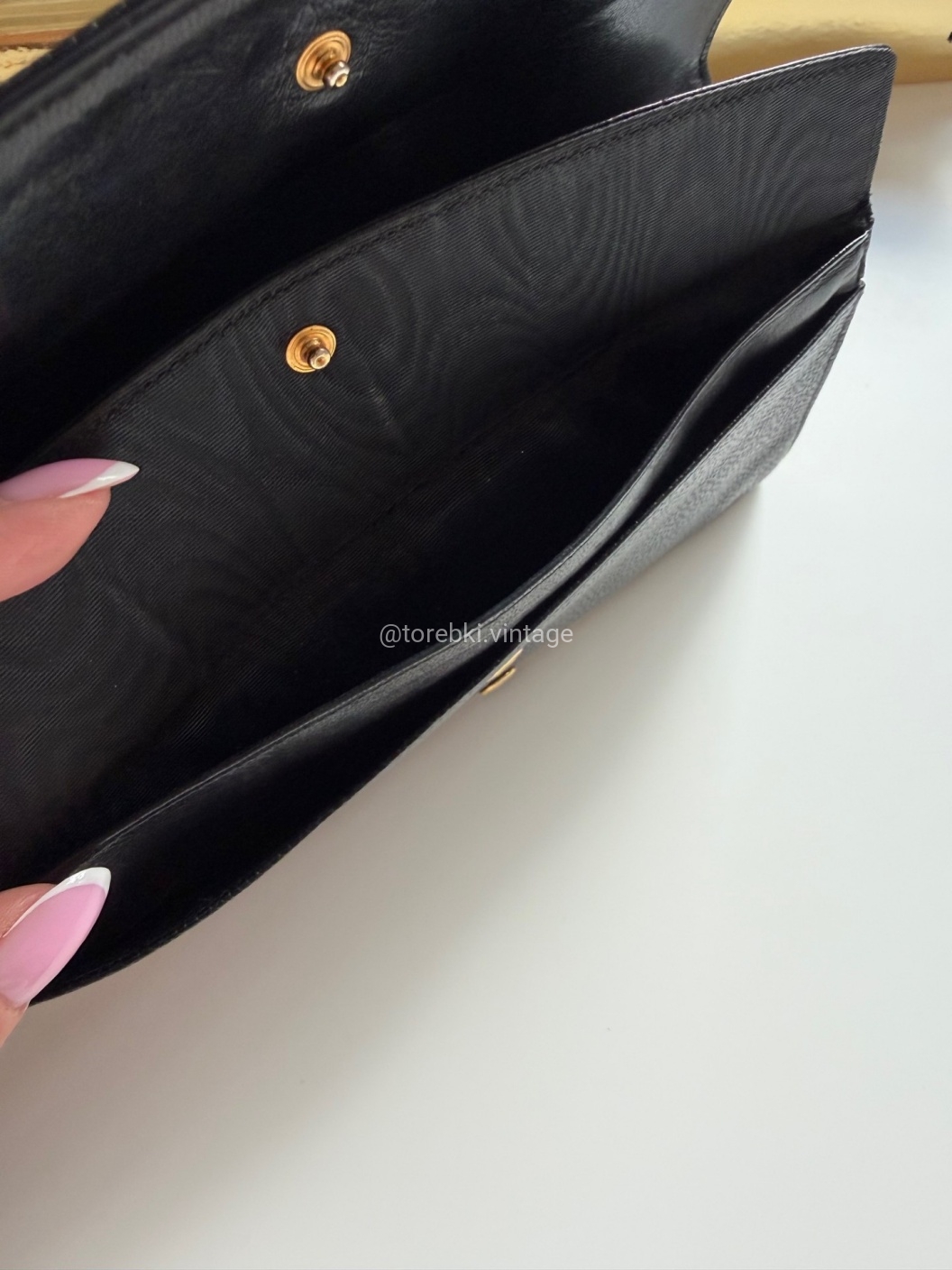 Ten przepiękny portfel Chanel wyprodukowany został w latach 1996-1997 i zważywszy na jego wiek, zachowany został w bardzo dobrym stanie. Wykonany został z niezwykle wytrzymałej skóry jagnięcej typu caviar. To jeden z tych modeli, który nigdy nie wychodzi z mody, a którego wartość rynkowa stale rośnie. Piękne, subtelne wyszywane logo. Skórzany środek zachowany został w bardzo dobrym stanie. Ze względu na swoje wymiary można z powodzeniem traktować go jako niewielką torebkę.