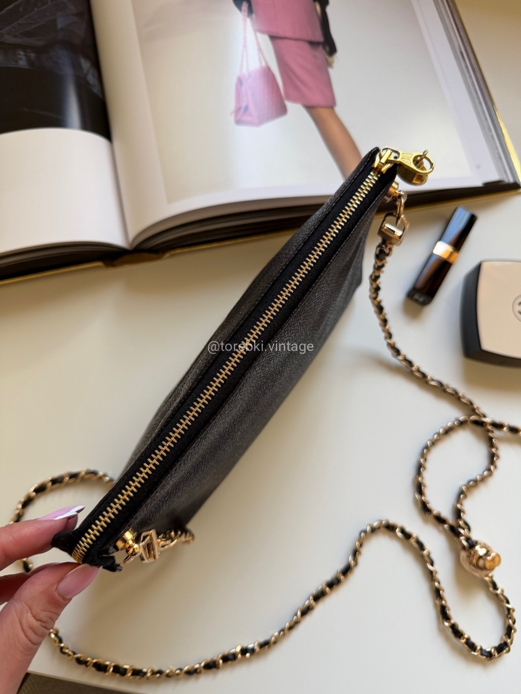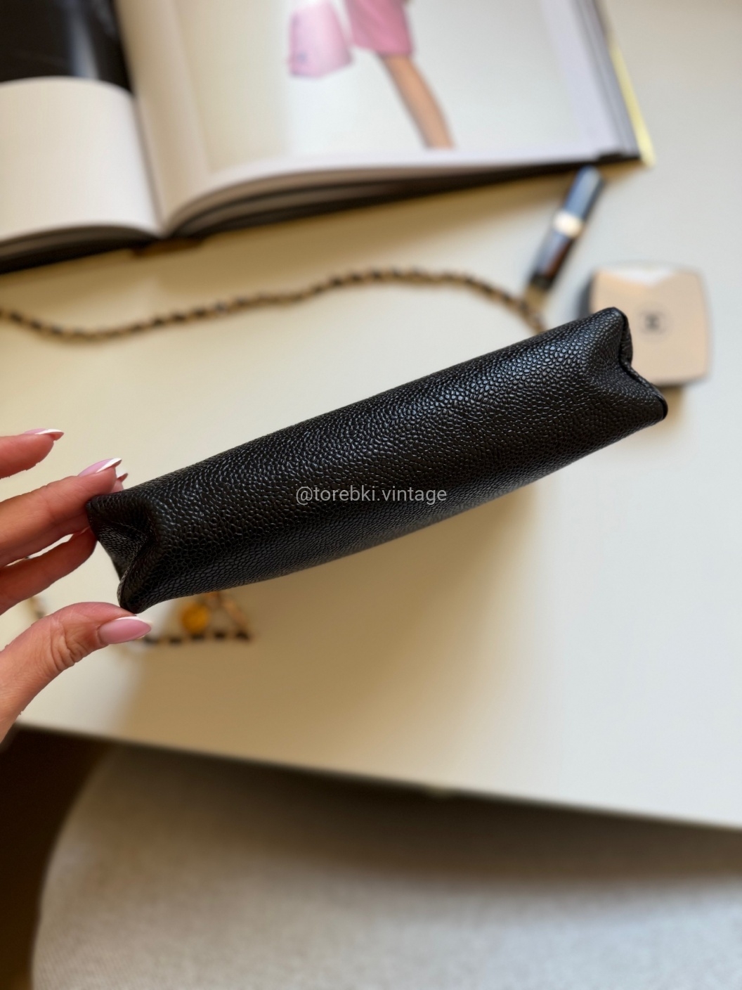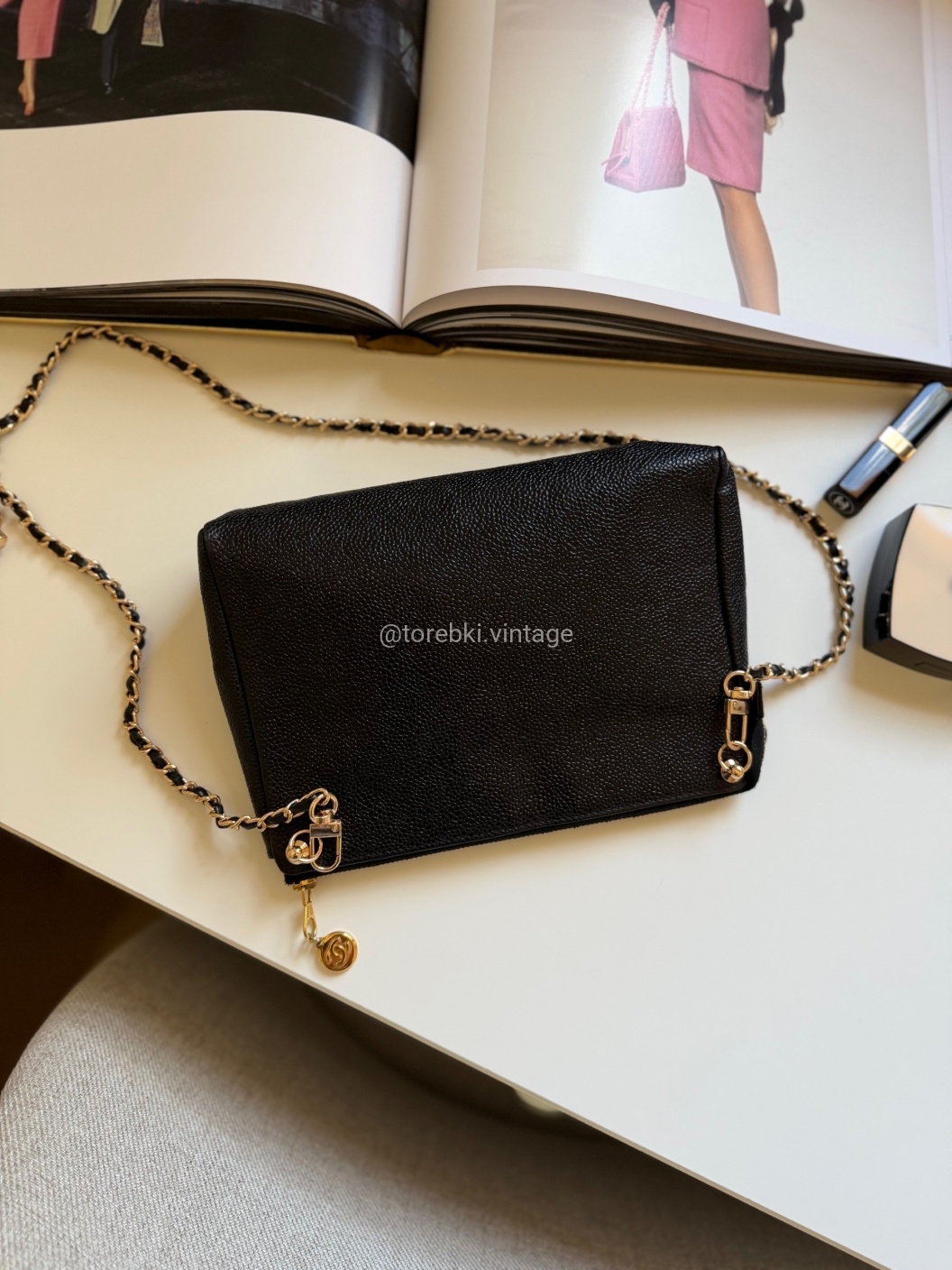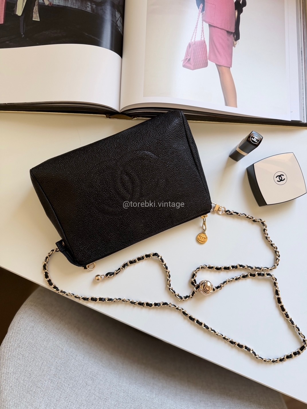 Łańcuszek można regulować kulką. Maksymalna długość łańcuszka to 130 cm (długość mierzona wraz z karabińczykami). Torebkę można nosić komfortowo jako crossbody. Ważna informacja - łańcuszek jest tylko i wyłącznie stylizowany na Chanel, nie jest to produkt marki.